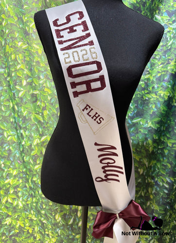 Our custom Senior Cheer sashes are created with top quality satin ribbon. Size: One size fits most. Total sash length is 36". All of our sashes are NOT sewn at hip to allow for a custom fit. Our satin sash pin bows beautifully complete the look and are sold separately.